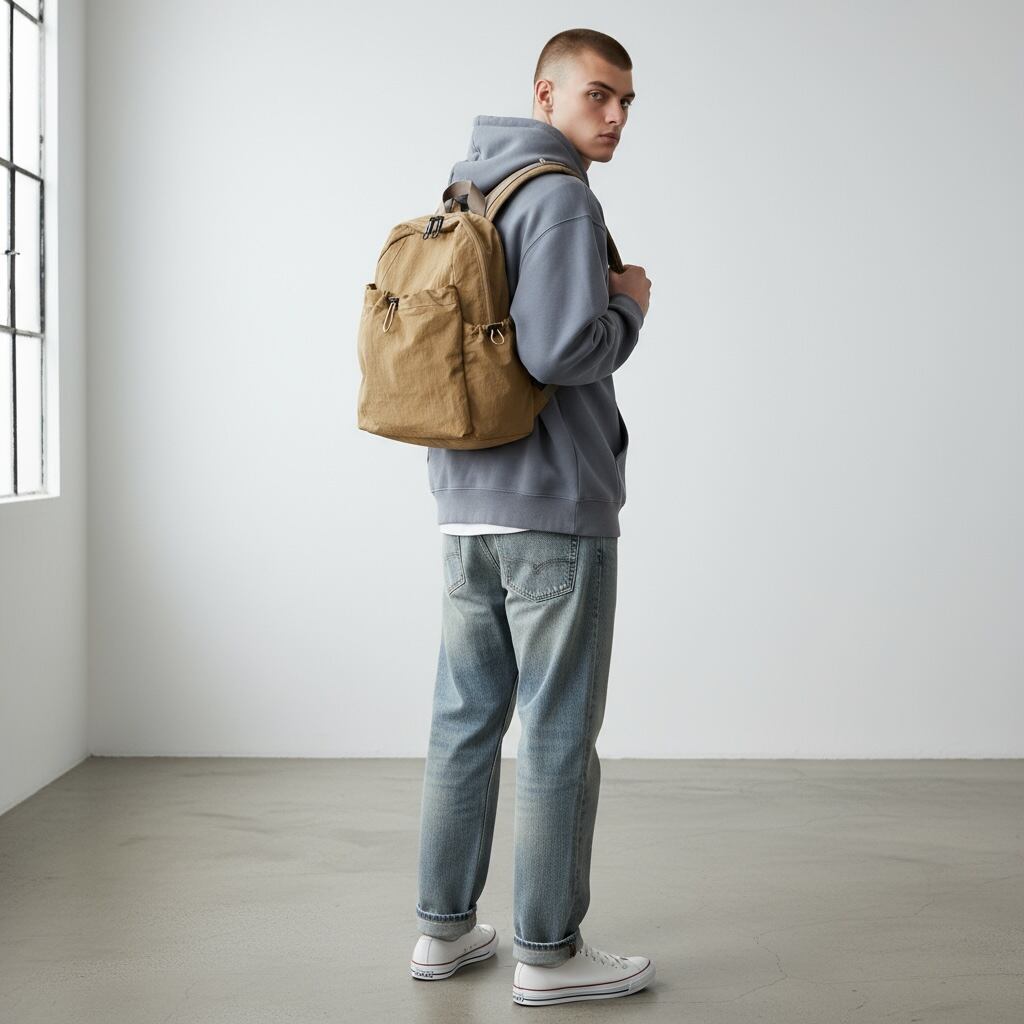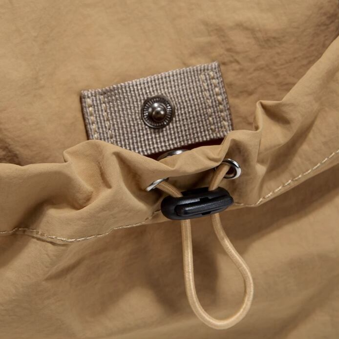 軽快感のあるナイロン素材を使用した、シンプルなデザインのバックパック。W26×H37×D14.5cmのユニセックスなサイズ感は、オフィスカジュアルバッグとしての利用にも最適。メイン荷室にはPCポケットが設けてあります。外側中央のドローコード式大型ポケットには、すぐに取り出したい小物を収納可能。両サイドにもドローコードポケットが設けてあり、ペットボトルや折り畳み傘もスマートに持ち運べます。軽やかなナイロン素材が生む程よいカジュアル感は、堅苦しさのないビジネスカジュアルスタイルにもおすすめ。毎日の通勤バッグとしての利用からアフター5、週末の利用まで、あらゆるシーンで活躍する万能バックパックです。