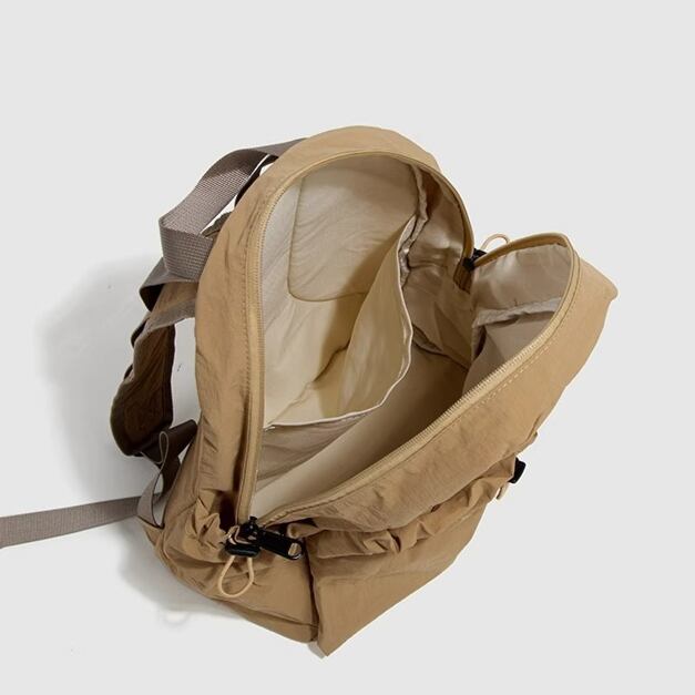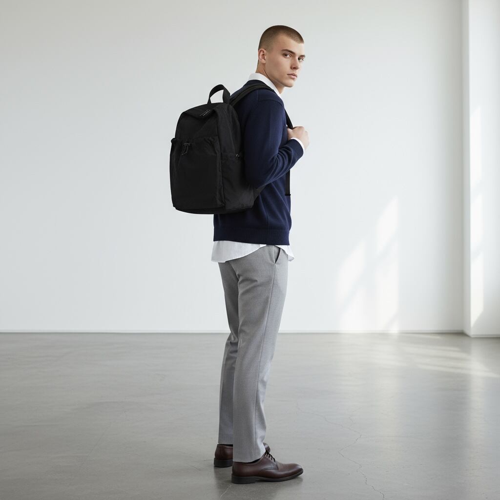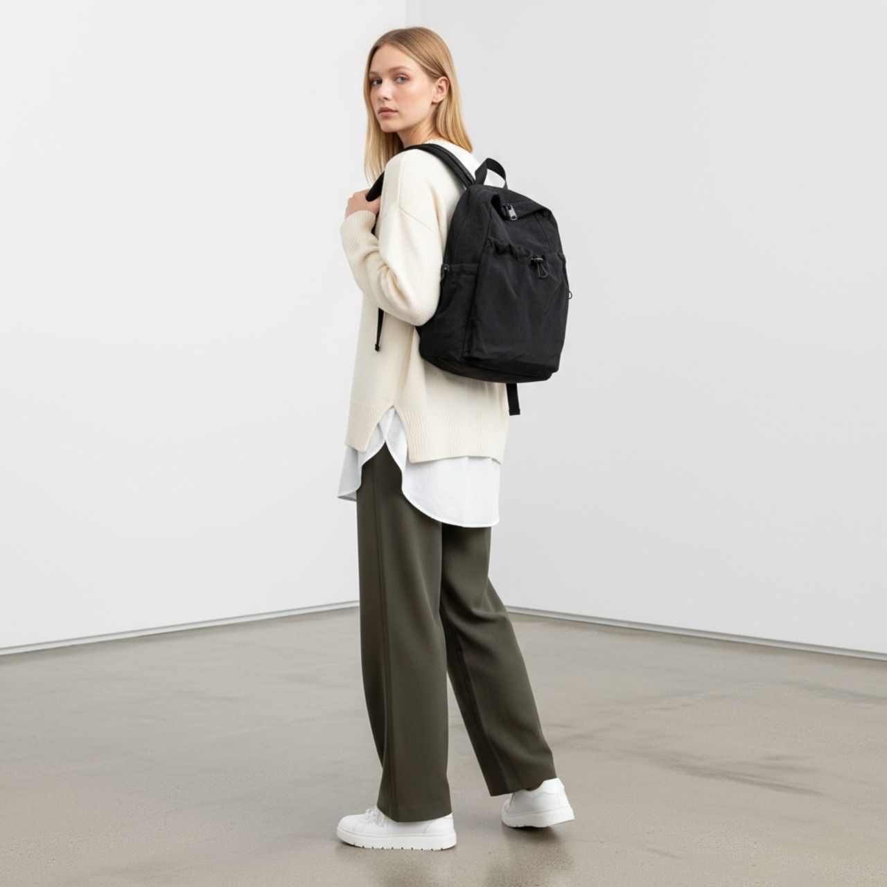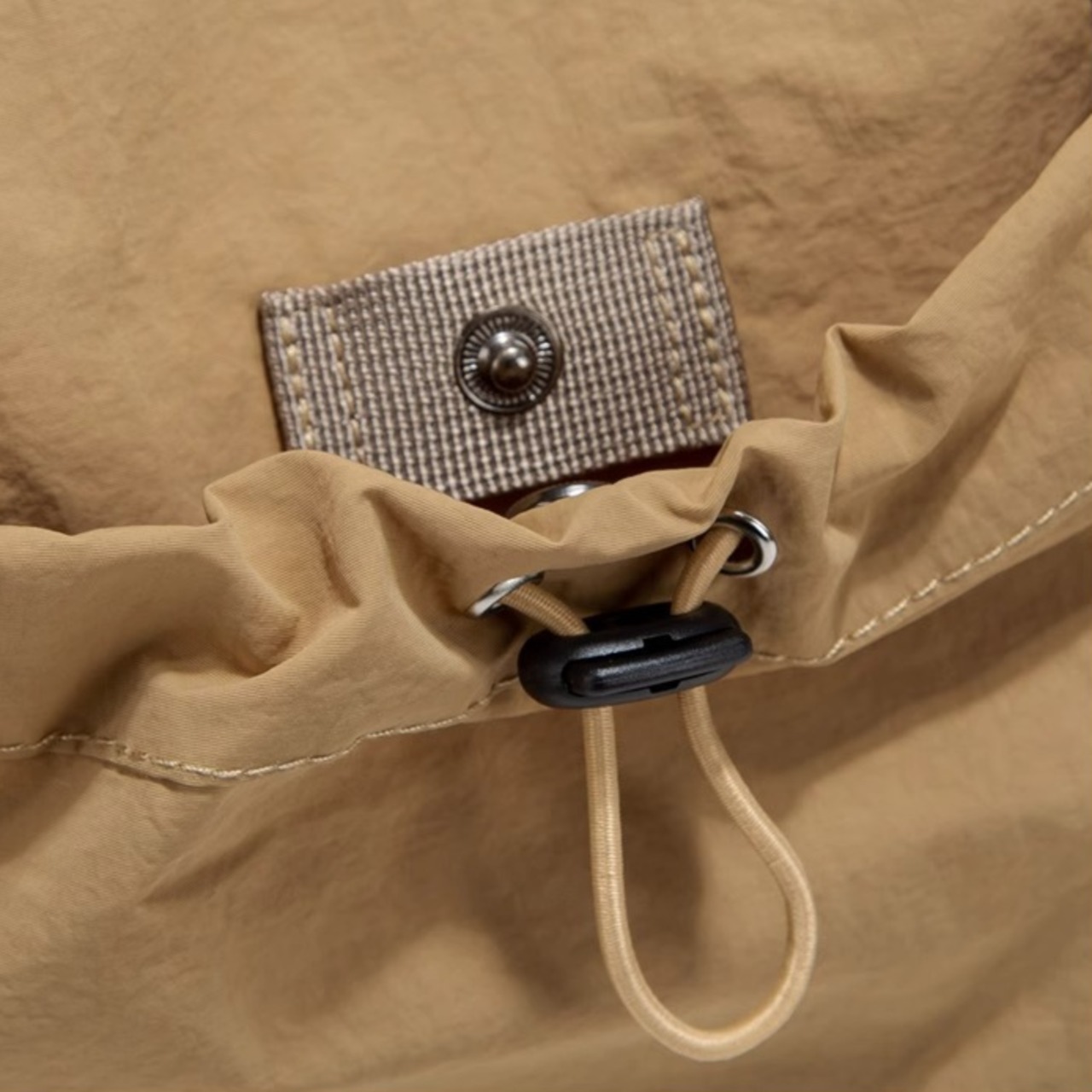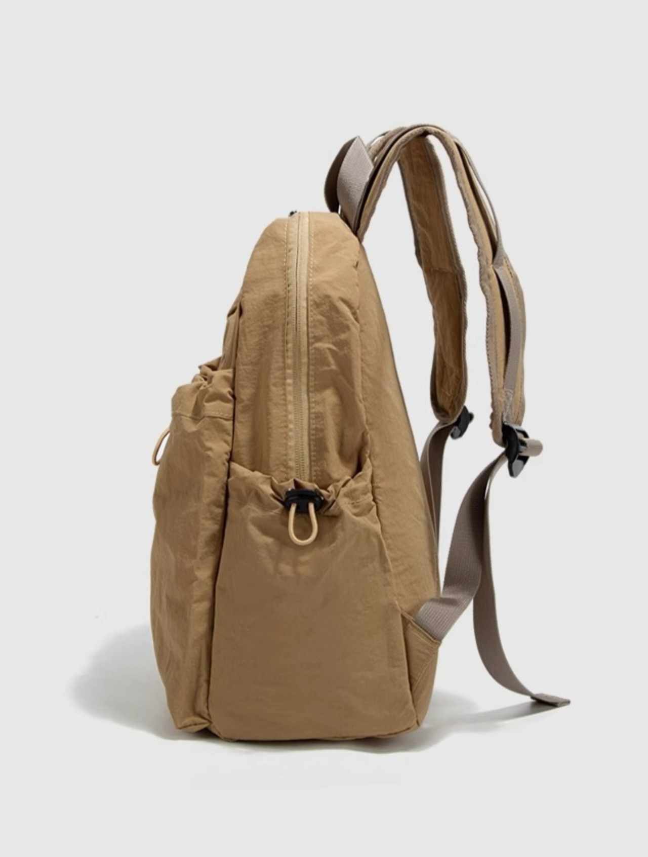 軽快感のあるナイロン素材を使用した、シンプルなデザインのバックパック。W26×H37×D14.5cmのユニセックスなサイズ感は、オフィスカジュアルバッグとしての利用にも最適。メイン荷室にはPCポケットが設けてあります。外側中央のドローコード式大型ポケットには、すぐに取り出したい小物を収納可能。両サイドにもドローコードポケットが設けてあり、ペットボトルや折り畳み傘もスマートに持ち運べます。軽やかなナイロン素材が生む程よいカジュアル感は、堅苦しさのないビジネスカジュアルスタイルにもおすすめ。毎日の通勤バッグとしての利用からアフター5、週末の利用まで、あらゆるシーンで活躍する万能バックパックです。
